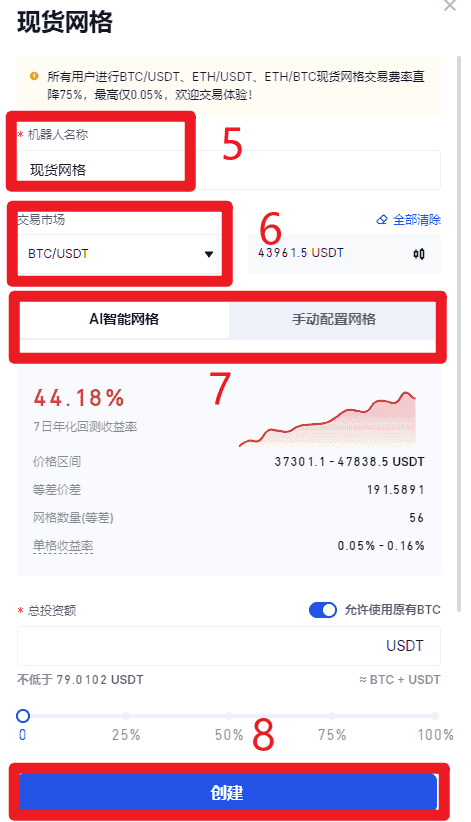 AI智能网格:AI 智能网格是根据近 7 天的历史数据,进行回测,自动算出收益率最高的网格参数: 上限价格、下限价格、网格数量,用户只需选择投资金额比例(选择的投资额必须大于等于最低投资额)。