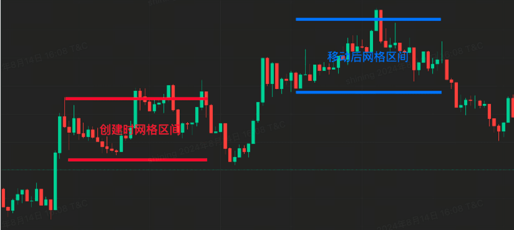 第一,网格区间最高价和最低价的移动幅度保持一致,如网格最高价移动10%,最低价也会移动10%。