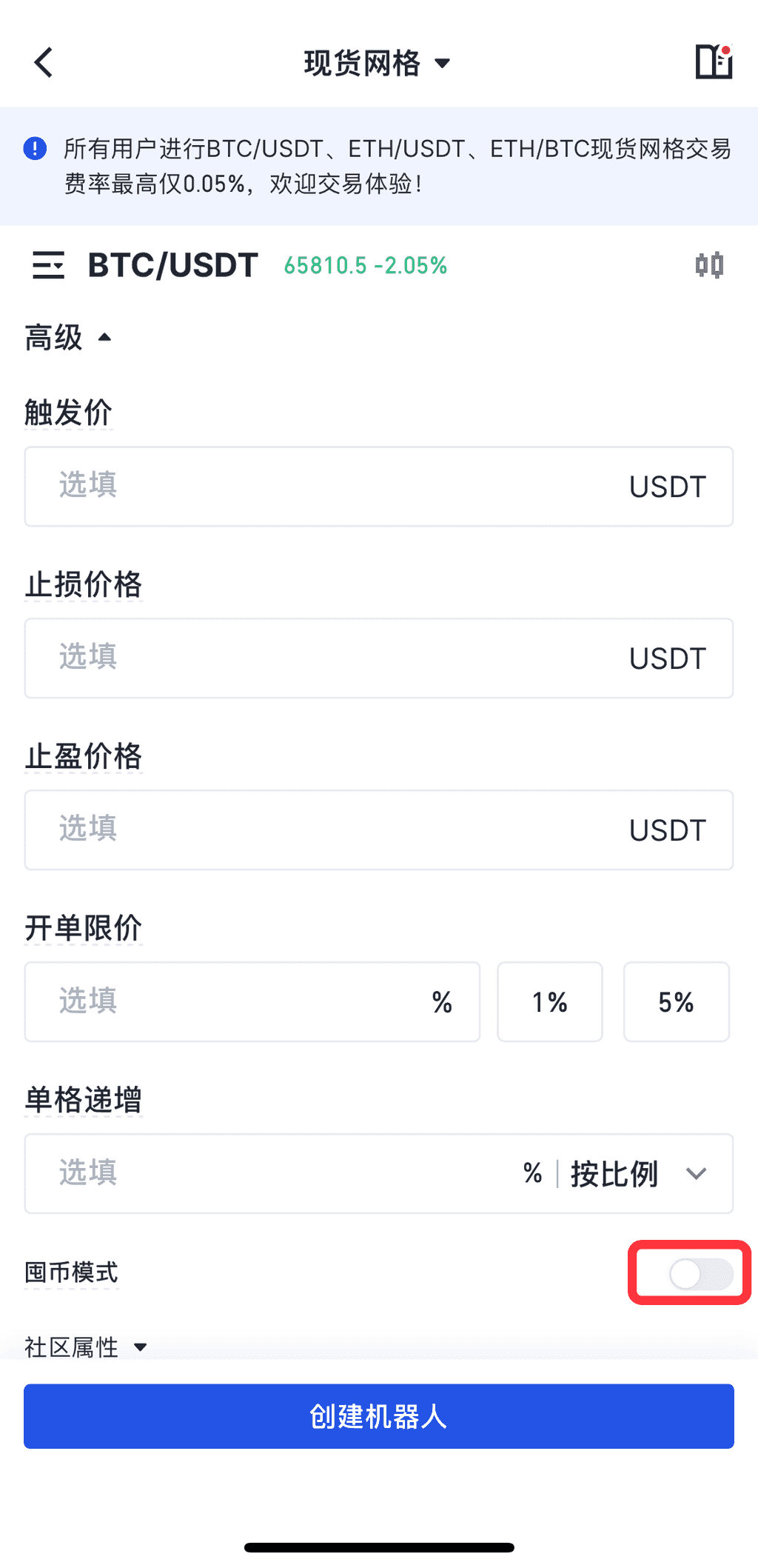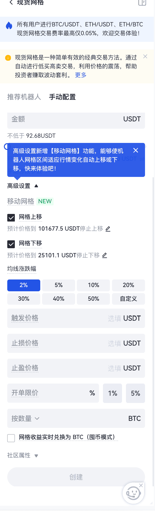 交易机器人主页 - 现货网格-点击“交易机器人” - 网格机器人 - 现货网格 - 手动配置 -高级设置- 填写移动网格相关参数