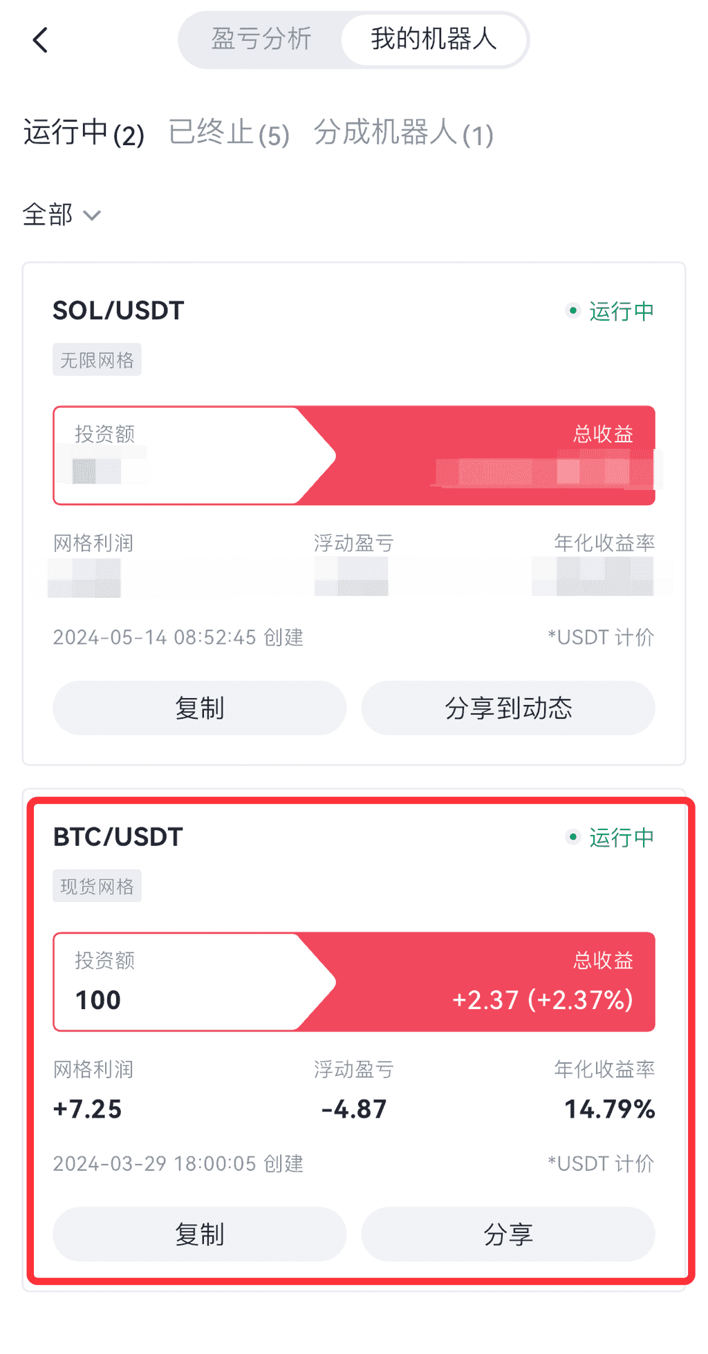 进入我的机器人 - 进行中机器人 - 现货网格,进入到现货网格机器人订单,即可查看/提取现货网格收益。