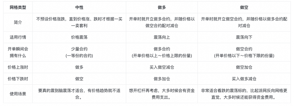 2.适用行情更多:做多网格机器人适用于震荡上涨行情,做空网格机器人适用于震荡下跌行情,中性网格机器人适用于用户对价格变动方向不明确的震荡行情;