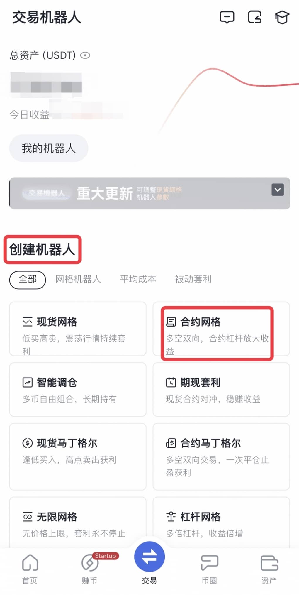 导航栏—交易机器人—机器人广场—创建新机器人—推荐—合约网格—点击创建机器人—配置参数—点击创建