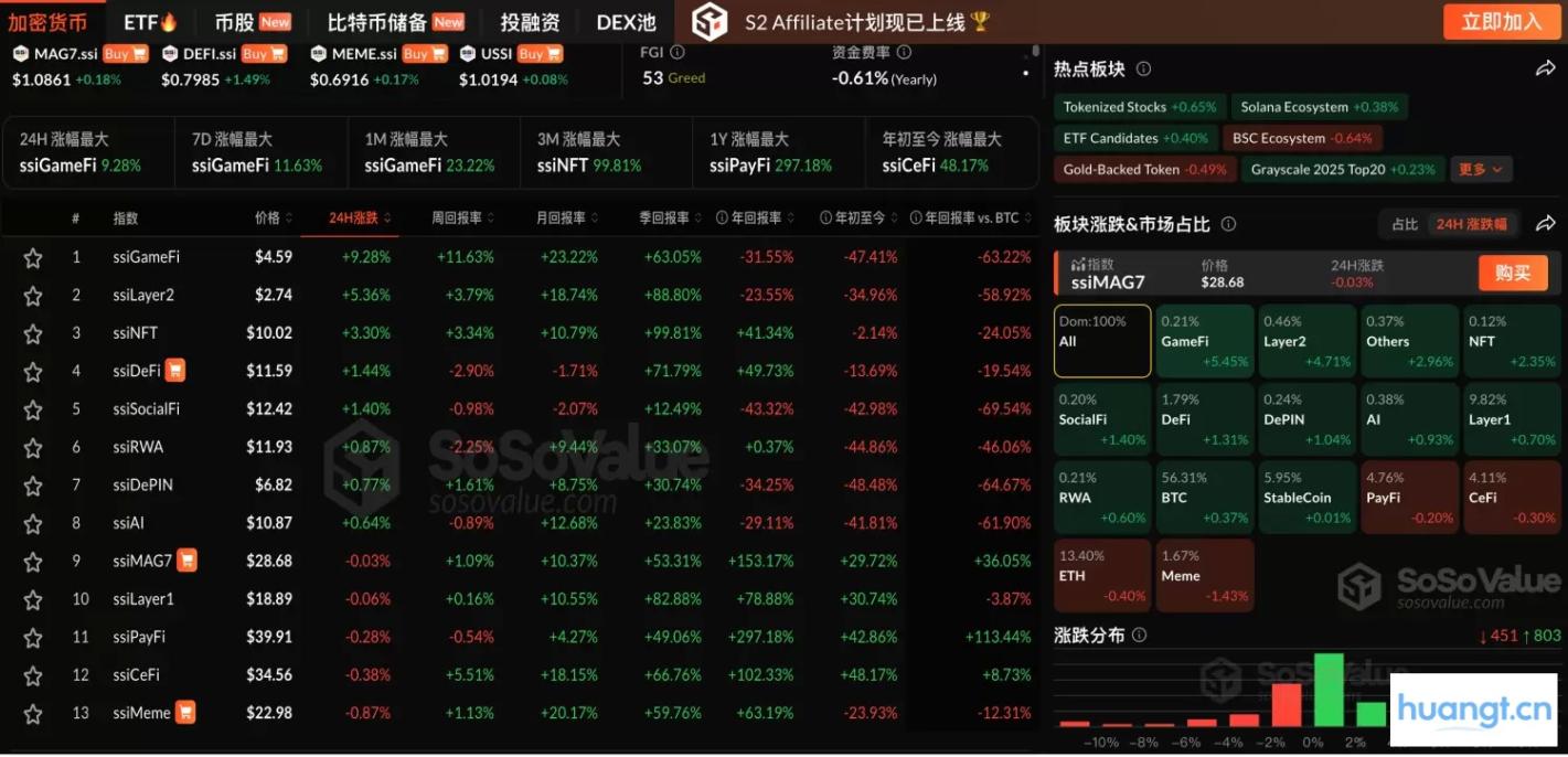反映板块历史行情的加密板块指数显示,ssiGameFi、ssiLayer2、ssiNFT 指数分别上涨9.28%、5.36%、3.30%。