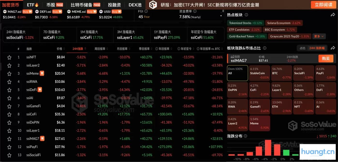 huangt 消息,根据 SoSoValue 数据,加密市场各板块全线下跌,24小时跌幅普遍约达2%至6%,其中,Meme 板块领跌5.93%,板块内,Pump.fun(PUMP)下跌10.16%,BUILDon(B)下跌16.07%。此外,Bitcoin(BTC)下跌0.77%,跌破11.5万美元,Ethereum(ETH)下跌2.96%,跌破4400美元关口。