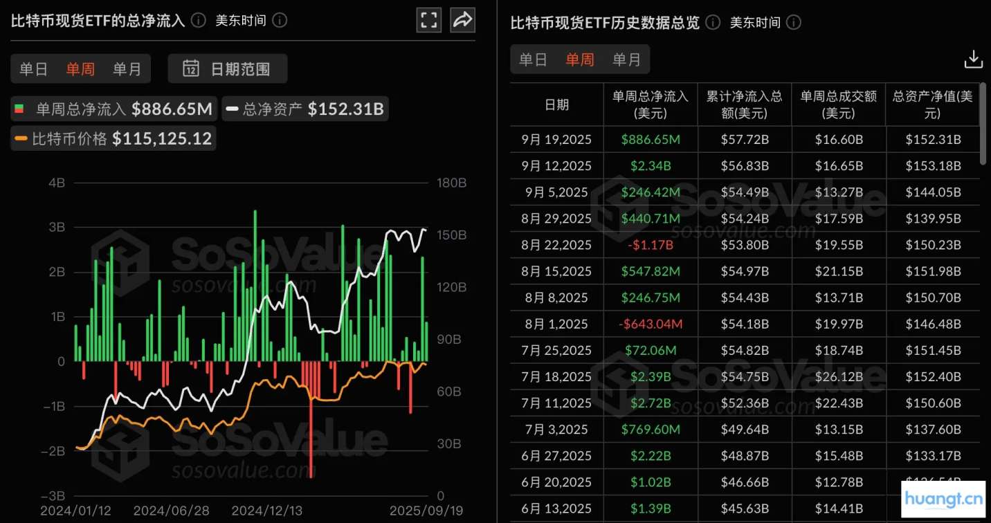 huangt 消息,根据 SoSoValue 数据,上周交易日(美东时间 9 月 15 日至 9 月 19 日)比特币现货 ETF 上周单周净流入 8.87 亿美元。
