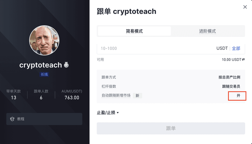 跟单用户开启此设置后,当交易员增加新的合约市场或带单新上架的合约市场,跟单用户将自动跟随新增合约市场。