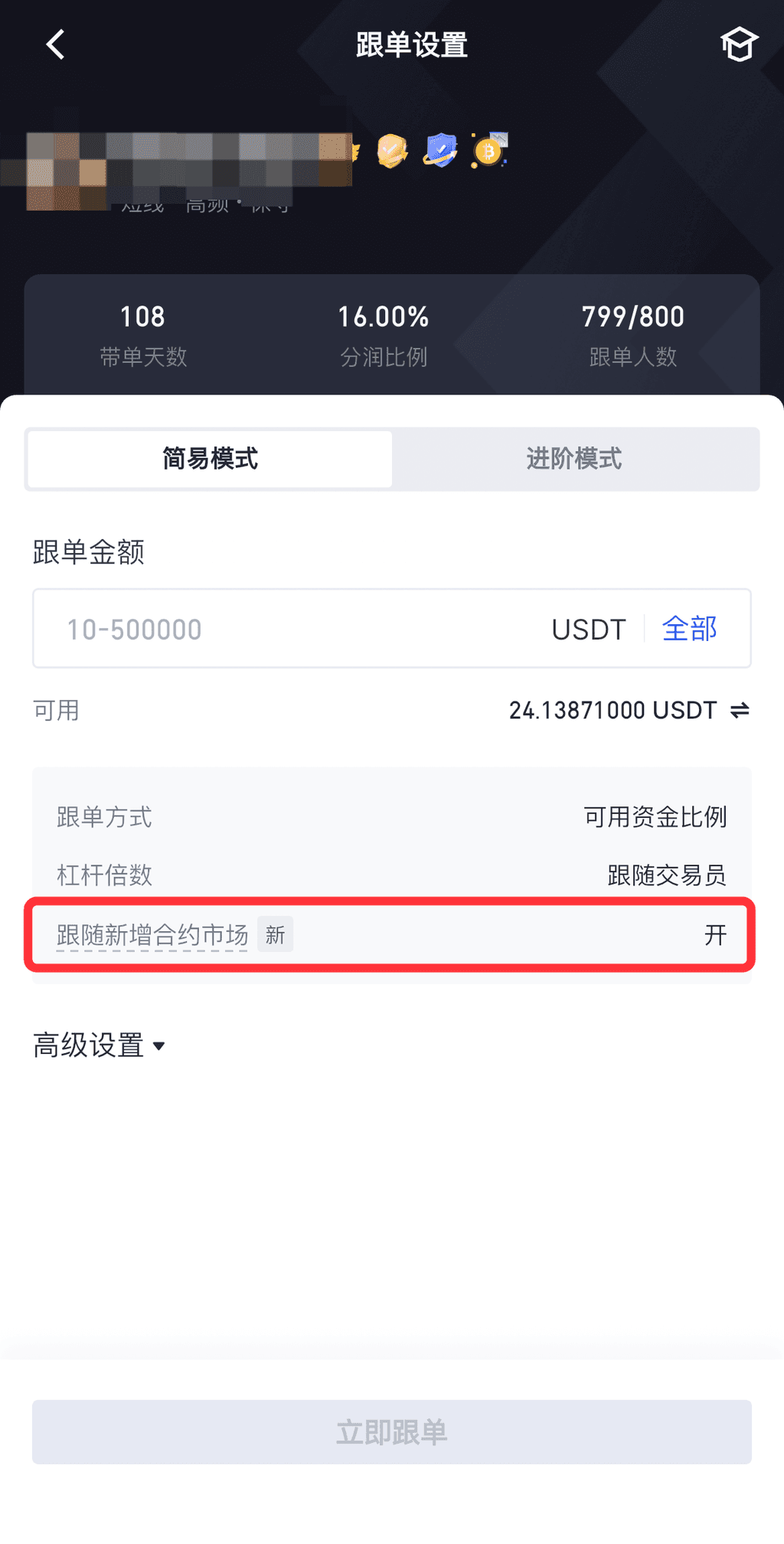 进阶跟单模式:点击“我的实盘” - 选择交易员进行跟单 - “进阶模式” - “高级” - 勾选“自动跟随新增市场”。