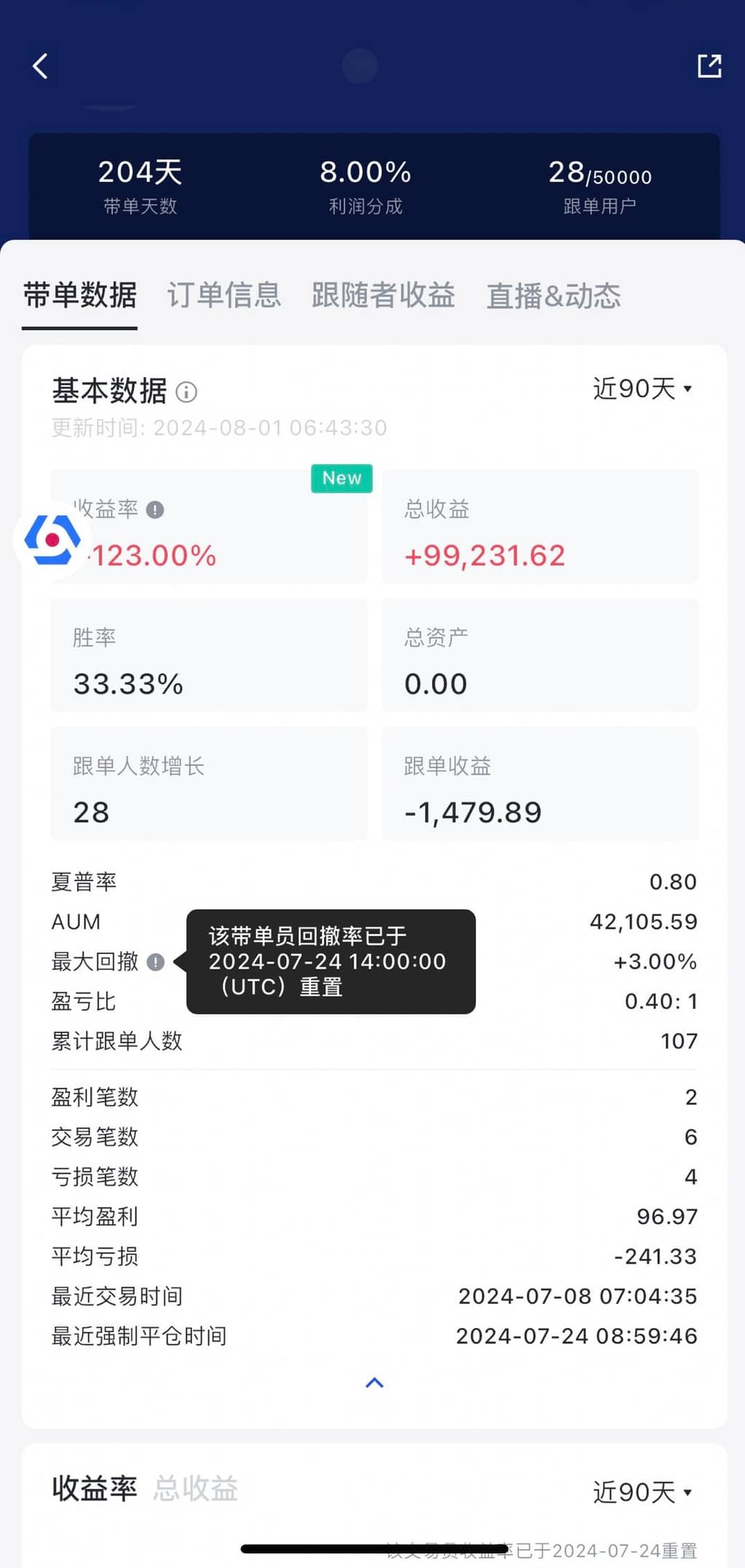 3.爆仓后重置收益率(功能预告):用户爆仓后,可以手动进行收益率重置。当然,重置也有一定的前提条件,即要求用户无仓位、可用余额大于300U且历史重置次数为0。重置操作需手动触发,并要求选择重置时间。重置后,带单员的净值将初始化为1,举例: 交易员在 1:31 重置,则2点多计算净值时,默认1点初始净值为1。而重置后用户收益率将从0开始计算,历史收益率不能改动,将一直保留。且前端会展示特殊标识(如下图所思),为了保护跟单用户的权益,帮助其更精准选择带单员,爆仓重置标识将长期有效,因此各位带单员需谨慎操作,尽量降低爆仓风险。