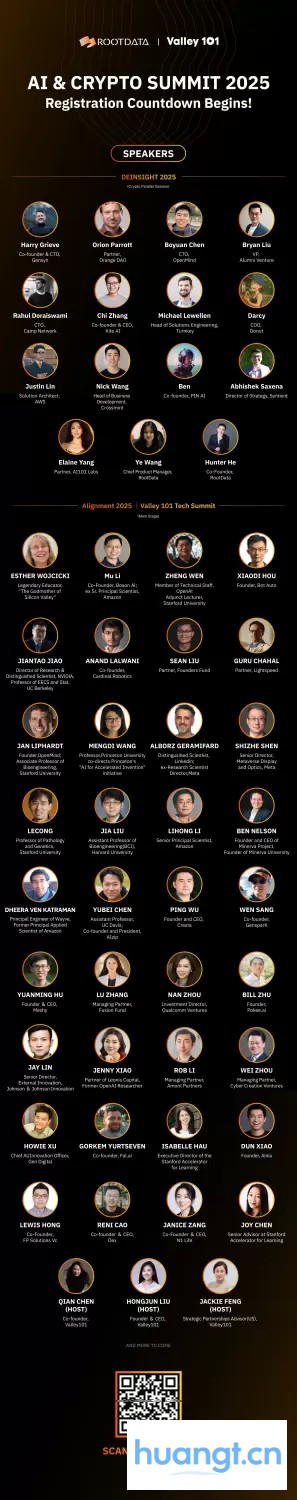 据悉,峰会设置《Valley 101 Alignment 2025 Tech Summit》、《DeInsight 2025》两大论坛。区块链媒体 huangt 、代理加密浏览器 Donut 以及 Al+Web3 投资加速器 AI101Labs 将联合举办《DeInsight 2025》论坛。