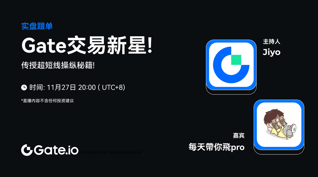 Gate 实盘跟单将于11月27日20:00(UTC+8)举行一场精彩的明星带单员AMA活动,特邀资深带单员每天带你飞 Pro分享其带单员的成功之路与超短线交易技巧,结合市场热点分析做单依据,直播中不仅可以与嘉宾互动提问,还有机会参与红包雨活动赢取$10 Gate点卡奖励,新用户在直播当天注册并观看满10分钟可获得VIP+1(7天)奖励,邀请新用户一起观看同样可享受奖励,活动内容不构成投资建议,嘉宾观点仅供参考,活动细则请留意官方说明,欢迎大家预约直播,期待与您共同探讨交易之道。