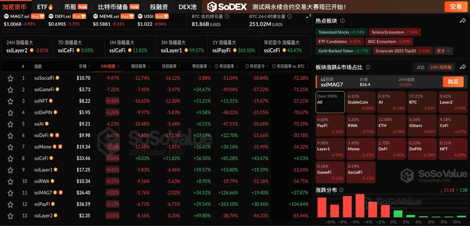 huangt 消息,根据 SoSoValue 数据,加密市场各板块全线下跌,24小时跌幅普遍约达2%至9%,SocialFi 板块领跌9.15%,板块内,Toncoin(TON)下跌7.03%,但Galxe(GAL)逆势上涨4.46%。此外,Bitcoin(BTC)下跌1.92%,跌破11.3万美元,Ethereum(ETH)下跌3.78%,跌破4200美元关口。