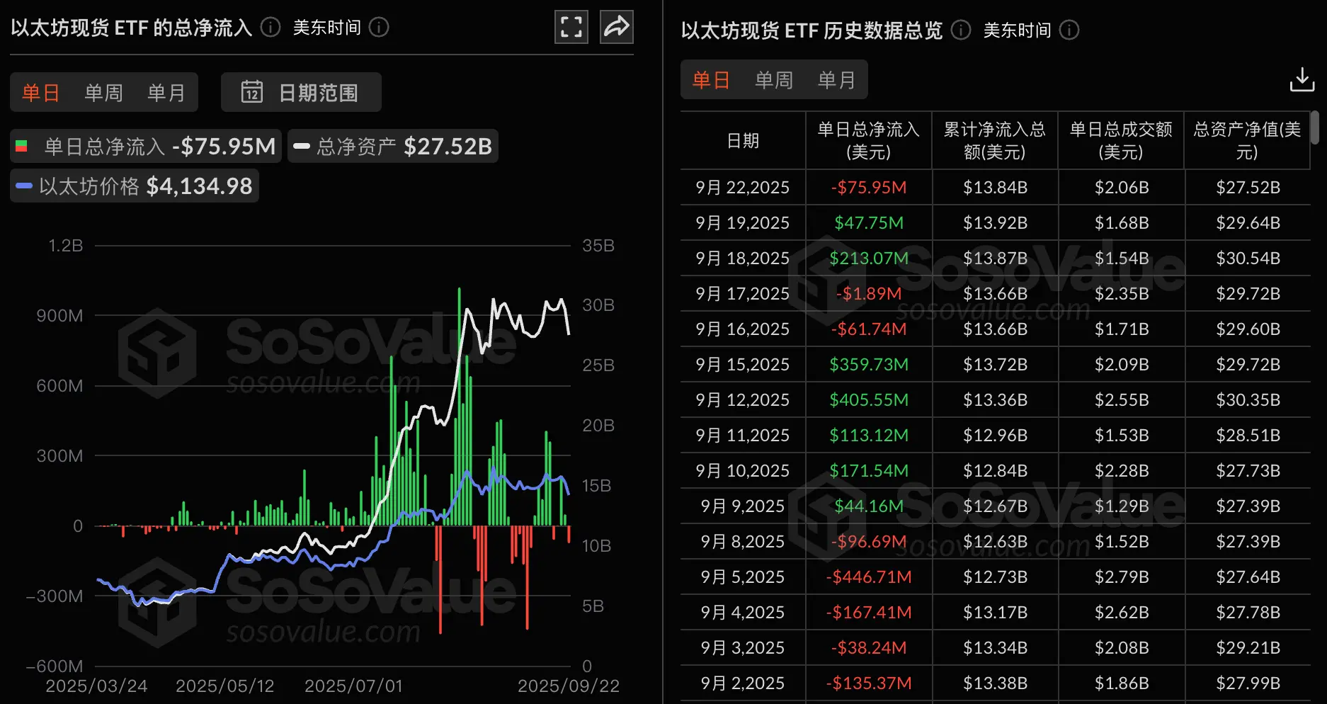 huangt 消息,根据 SoSoValue 数据,昨日(美东时间 9 月 22 日)以太坊现货 ETF 总净流出 7594.78 万美元,昨日单日净流出最多的以太坊现货 ETF 为富达(Fidelity) ETF FETH,单日净流出为 3312.16 万美元,目前 FETH 历史总净流入达 28.41 亿美元。其次为 Bitwise ETF ETHW,单日净流出为 2230.47 万美元,目前 ETHW 历史总净流入达 4.16 亿美元。