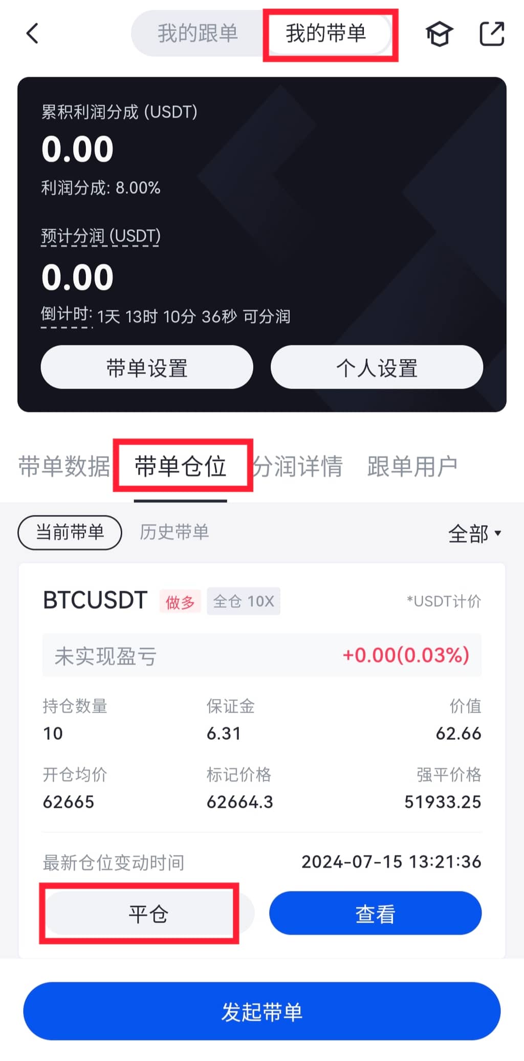 可以进入【带单模式】页面,在订单信息-当前带单列表中,点击【平仓】按钮将立即以市价平仓该合约,平仓后的历史订单会显示在历史订单中。