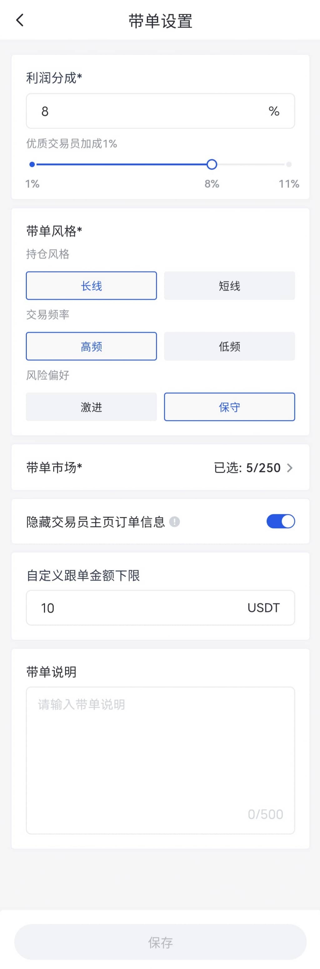 注意:成功申请成为带单员后,需要尽快完成带单参数设置开启带单,否则将可能被隐藏带单员主页,进入带单员冷静期。详情参考