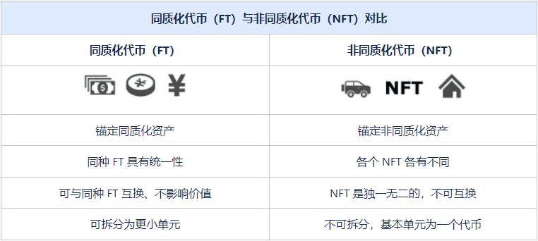 FT(Fungible Token)即同质化代币,是一种能够替换、具有统一性、可接近无穷拆分的代币 (Token),比如 BTC、ETH 都是同质化代币。