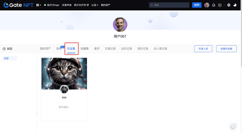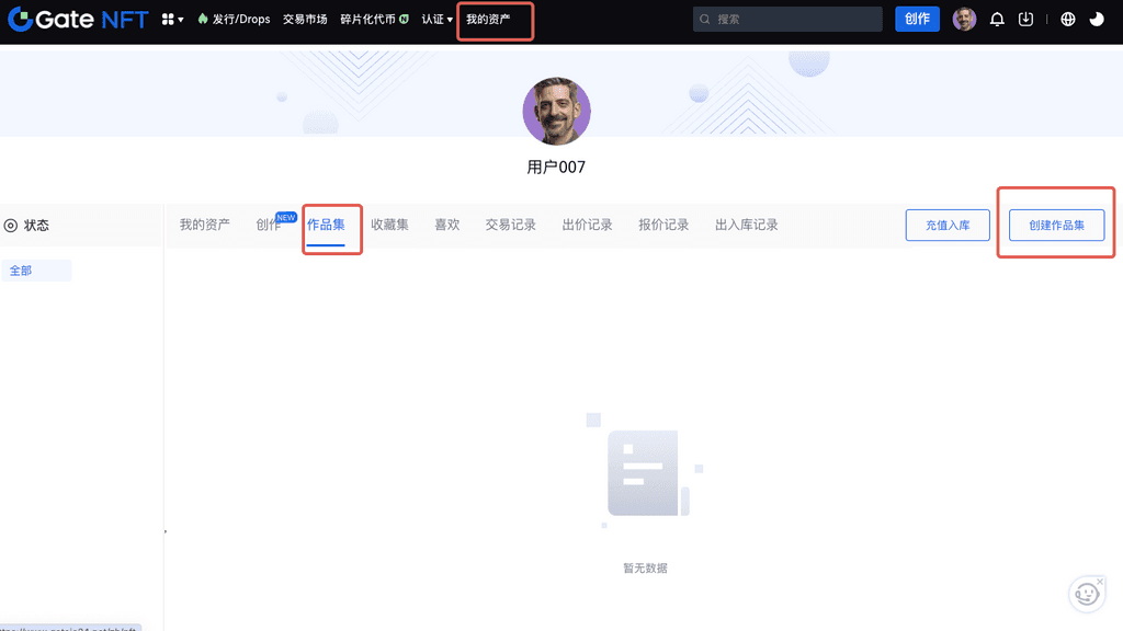 Step 1: 请您进入 Gate NFT 首页,点击并进入我的资产页面作品集列表,点击「创建作品集」按钮,即可进入作品集创建页面。
