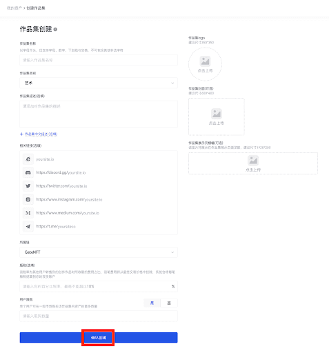 Step 2: 在作品集创建页面,上传作品集logo,填写作品集名称,从下拉列表中选择作品集类别,点击「确认创建」按钮,即可创建一个全新的 NFT 作品集;当然您也可以通过上传作品集封面、作品集展示页横幅,添加作品集描述、版税、用户限购等内容自定义您的 NFT 作品集。