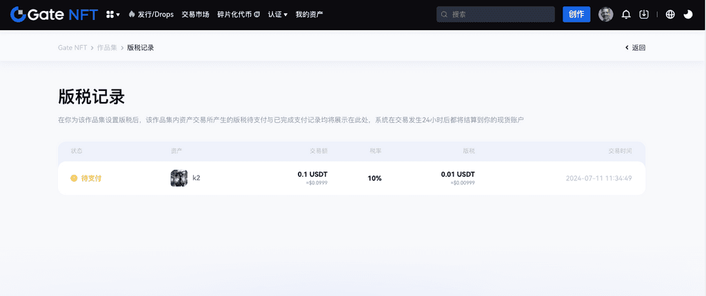 Step 4:在版税记录页面,创作者可查看该作品集内已发生转售的资产相关版税支付记录。