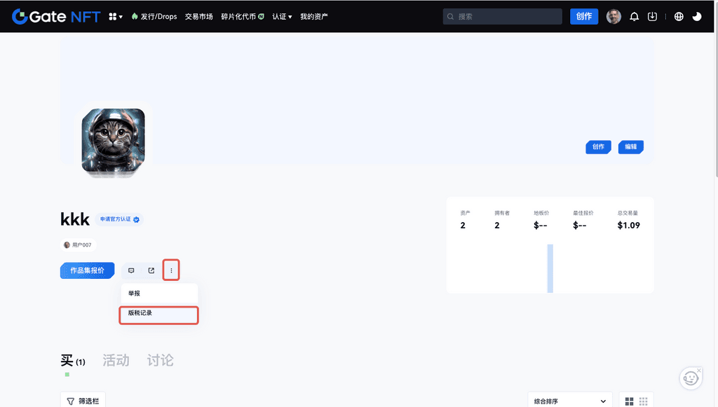 Step 3:进入作品集详情页面,点击“⋮” 后,选择「版税记录」按钮。