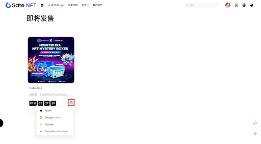 同样的,在即将发售板块,您可以了解并查看即将开售的盲盒NFT项目,如果您想要在活动开始时准时抢购盲盒NFT发售,可以通过点击日历预约按钮,选择您想要添加活动日程的日历平台,添加后在活动开始前您会收到抢购盲盒发售的提醒。