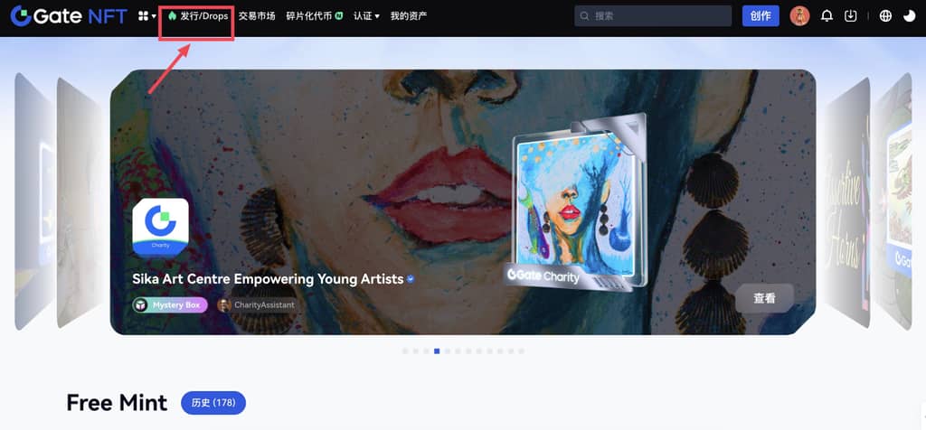 Step 1:前往 NFT 首页并点击「发行/Drops」进入Drops 页面。