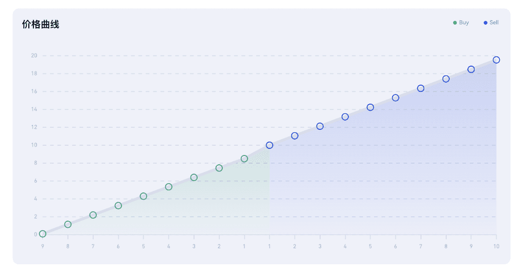 下图为指数曲线流动性池的案例,流动性池同样由 10 个 NFT 及 10 枚 ETH 所组成,此时 delta 为 0.1 每当有交易发生时,NFT 价格将乘以 1.1(作品单价 1+ delta 0.1)。