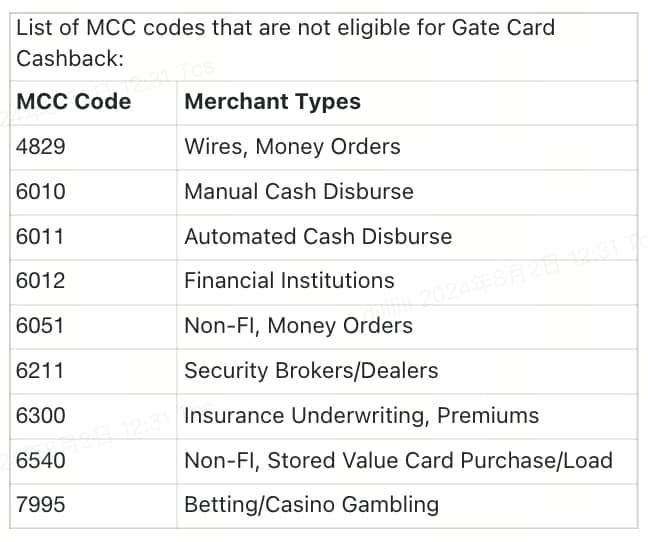 Here is the list of codes that are not eligible for Cashback, including ATM withdrawals, and will be updated by Gate side from time to time.
