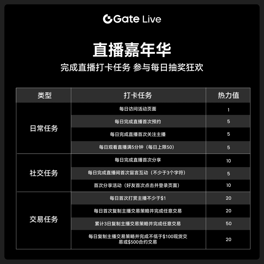 参与GateLive直播每日打卡任务,积极观看直播并与主播互动,赢取GT代币、精美周边、合约体验券等丰厚奖品,活动自公告发布之日起开始,结束时间请关注后续公告,完成任务可累计热力值,50点热力值可获得一次抽奖机会,分享活动页面并邀请新用户注册达3人可获得精美周边,热力值排行榜前10名用户将获得随机周边好礼,主播可享最高70%返佣和专属福利,活动期间需完成身份认证和交易总量要求以领取奖励,周边奖励将在提交邮寄信息后60日内发放,活动的最终解释权归Gate所有,立即参与,机会不容错过。