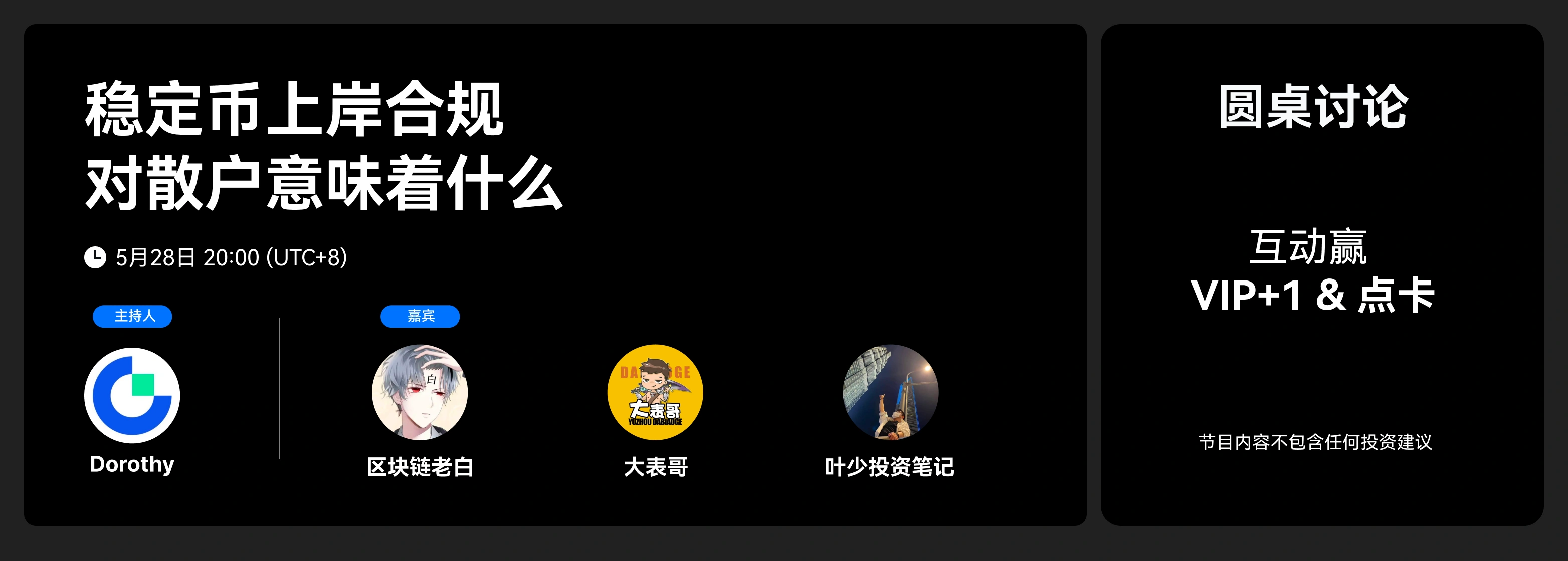 本期嘉宾(排名不分先后): 区块链老白、大表哥、叶少投资笔记