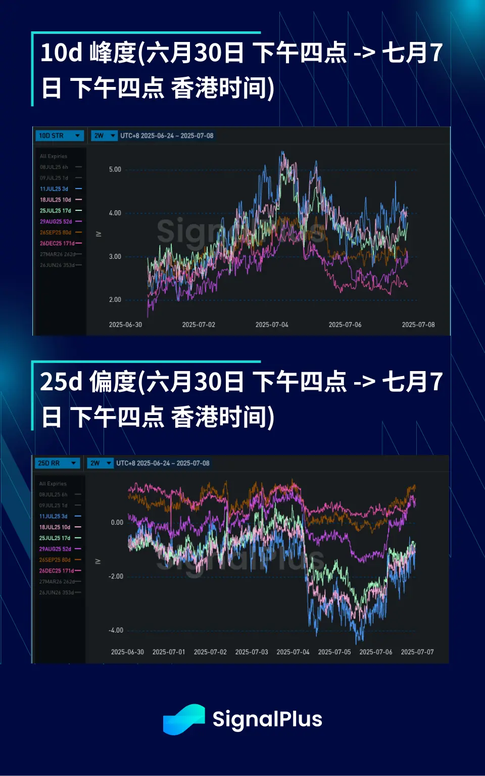 • 偏度在周末以前朝下方剧烈移动,因为市场担心特朗普的关税消息带来额外的负面影响,同时对 110 千美元往上突破的失败导致了一波向下插针。由于市场上存在对冲下方风险的需求同时波动平基本很低,导致偏度向下倾斜。在周末进一步下跌没有发生的情况下,偏度快速恢复。同时期限远方市场的需求量只在币价上方,所以远期的偏度更加稳定。