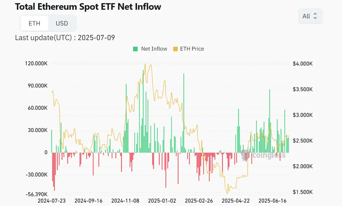 以太坊现货ETF上市初期吸引了一波资金,但2025年伊始这种热度逐渐衰减。比特币继续获资本青睐,而ETH则表现平淡。这种情况虽然在4月底开始得到改善,但和比特币的表现相比仍然不尽人意。截至2025年7月10日,美国比特币现货ETF资产约1375亿美元,而以太坊现货ETF资产规模仅约114亿美元,市场规模与比特币相差甚远,表明机构买盘疲软。