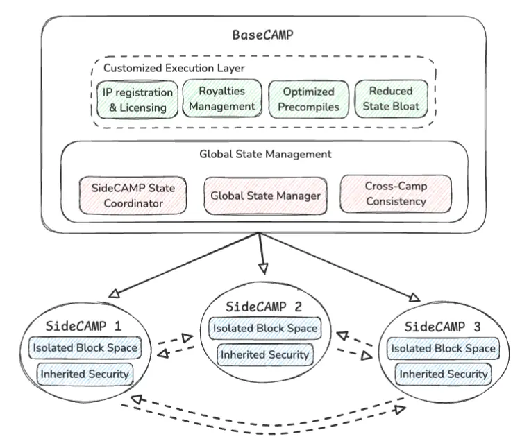 Camp Network 的区块链基础设施由 BaseCAMP 和 SideCAMP 组成。BaseCAMP 作为“全球状态管理器”,集中管理所有网络活动,记录 IP 注册、使用和结算情况,确保 IP 生态系统的可信度。SideCAMP 则为每个应用提供独立的执行空间,避免了不同应用之间的竞争,同时通过跨消息功能实现了不同 SideCAMP 之间的顺畅交互。