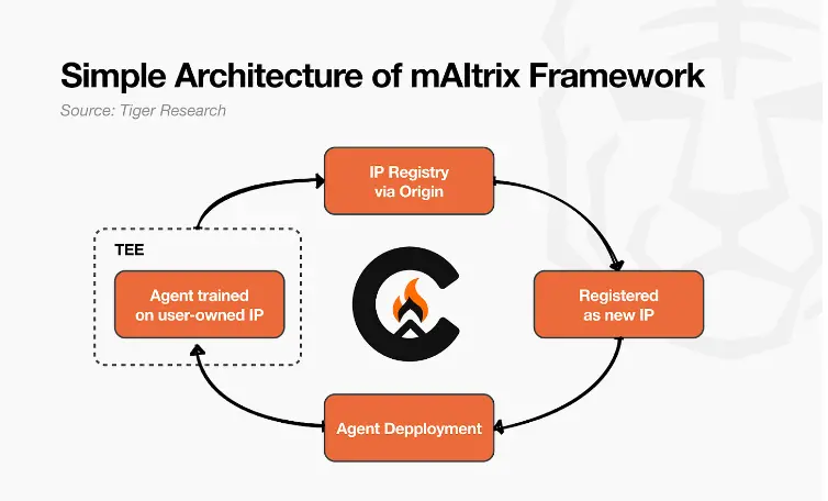 mAItrix 框架为 AI 代理的开发、训练和部署提供了集成的 SDK。它与 Origin 框架协同工作,将整个流程连接成一个完整的管道,从使用链上 IP 进行 AI 模型训练到通过 AI 代理生成衍生内容。mAItrix 的核心优势在于其对数据所有权的尊重,它仅使用明确归属的数据进行训练,从而避免了法律纠纷。