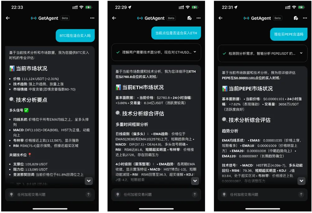 - 策略建议与风险提示:例如“笔者现在是否适合加仓 ETH?”,GetAgent 会综合技术信号和个性风险偏好给出区间参考与止盈止损建议;