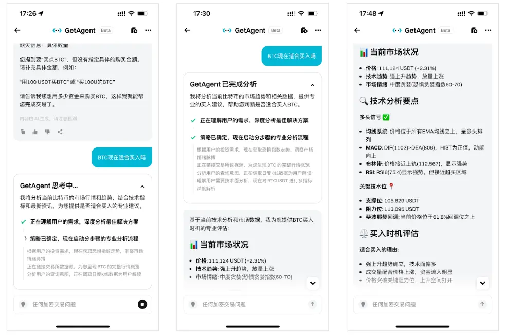例如笔者在测试中询问:“现在适合买入 BTC 吗?”GetAgent 会进入一个思考状态,在 UI 里可以点开查看他的思考过程: