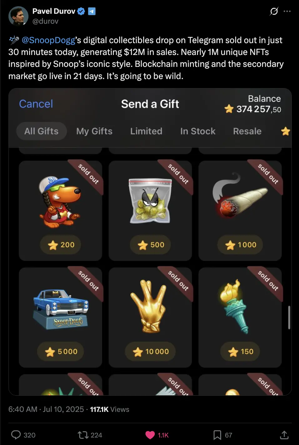 P.S. 就在本访谈直播后 24 小时,Snoop Dogg 发布了《Gifts》音乐视频,并推出 Telegram 礼物系列 —— 近 100 万份独特 NFT 在 30 分钟内售罄,销售额超过 1,200 万美元。