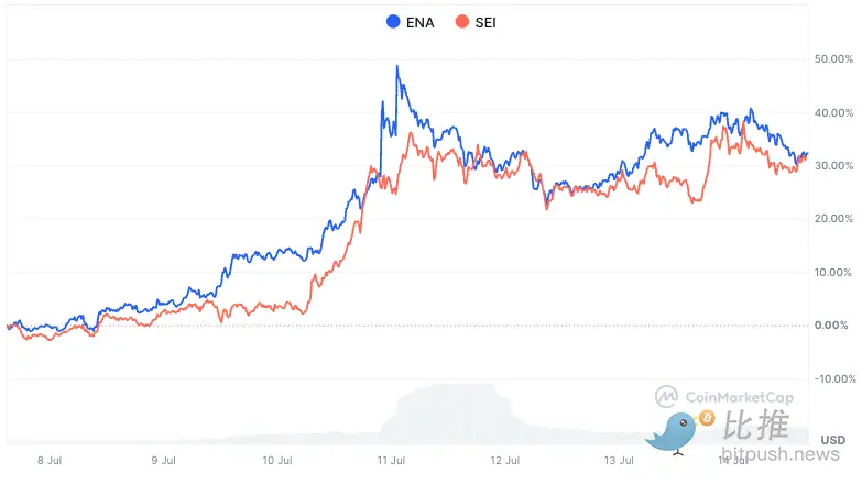 一些相对较新的山寨币,如专注于去中心化交易所(DEX)的 L1 项目 Sei(SEI)和合成美元协议 Ethena(ENA)涨幅同样不俗,7 日涨幅也超过了 30%。