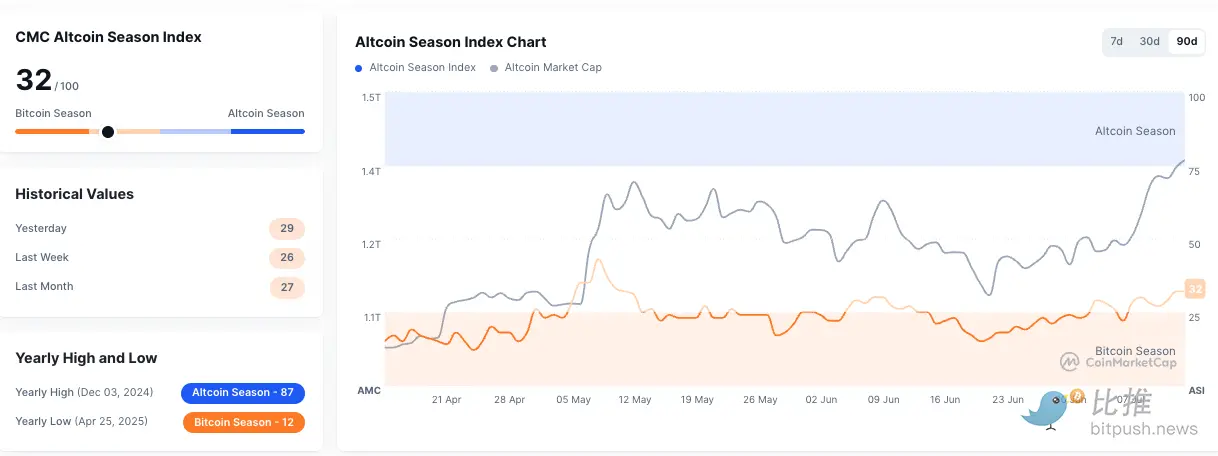 目前,山寨币季指数为 32/100,距离 75 点的阈值尚远,这表明市场仍处于比特币主导阶段。然而,该指数近期出现了积极的向上趋势(从上周的 26 点上升到今天的 32 点),这暗示了早期轮动迹象正在显现。