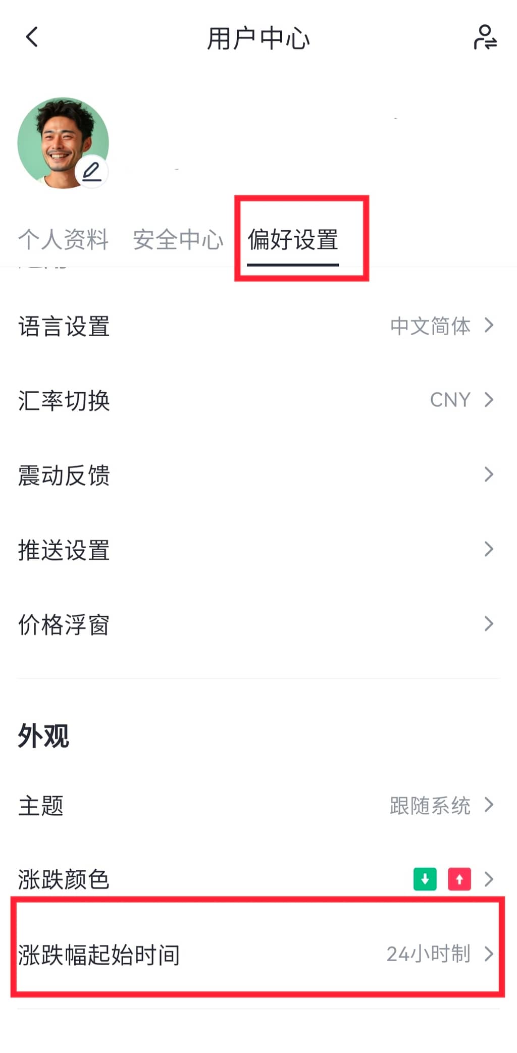 登录 App,在首页点击左上角 “头像” 标志,点击右侧箭头标志进入 “个人中心” - “偏好设置” - “涨跌幅起始时间”。