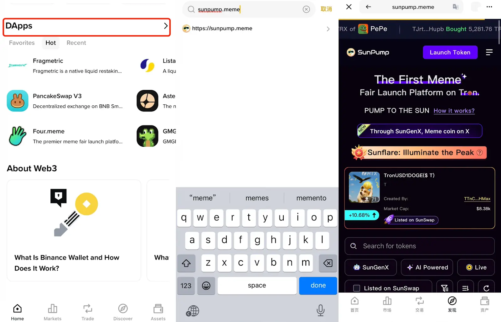 1、进入SunPump:在Binance钱包的DApps界面输入SunPump网址(sunpump.meme),进入SunPump应用页面。