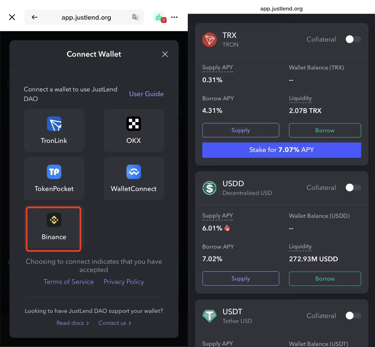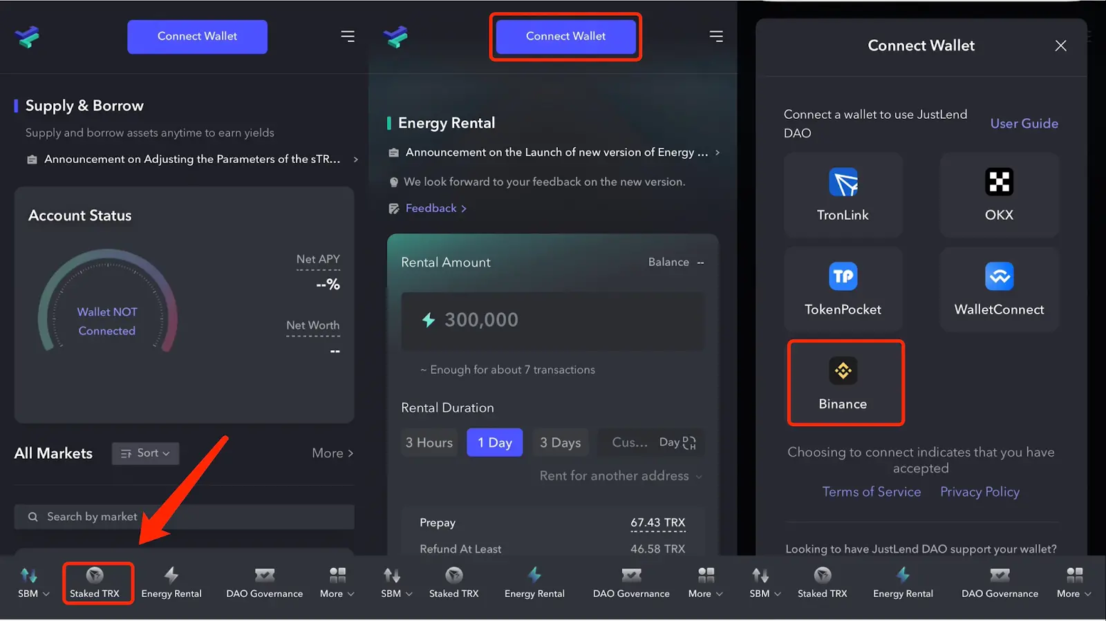 1、首先在 JustLend DAO 导航页进入“Energy Rental”页面,连接Binance钱包。