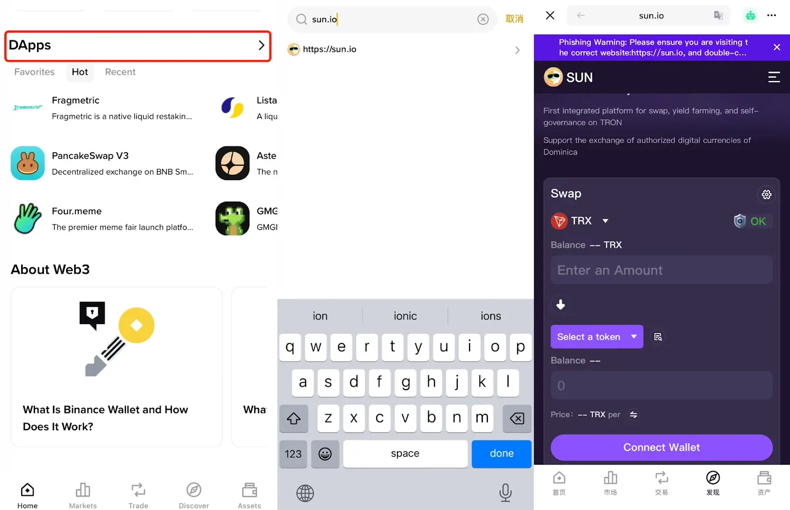 1、进入SUN.io:在Binance钱包的DApps界面输入SUN.io网址(sun.io),进入首页的Swap板块。