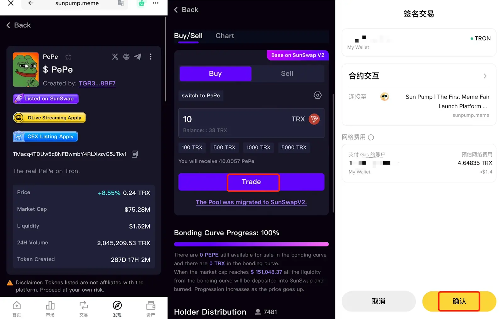 2、交易MemeCoin:选择Alpha专区上线的SunPump主流Meme币PePe与SUNDOG,使用 TRX 代币买入。SunPump 推出 Bonding Curve 机制购买代币,该机制为用户提供了友好的购买流程并轻松进入MemeCoin市场。同时,SunPump 提供灵活的交易选项,用户可以随时出售自己的代币,锁定收益。
