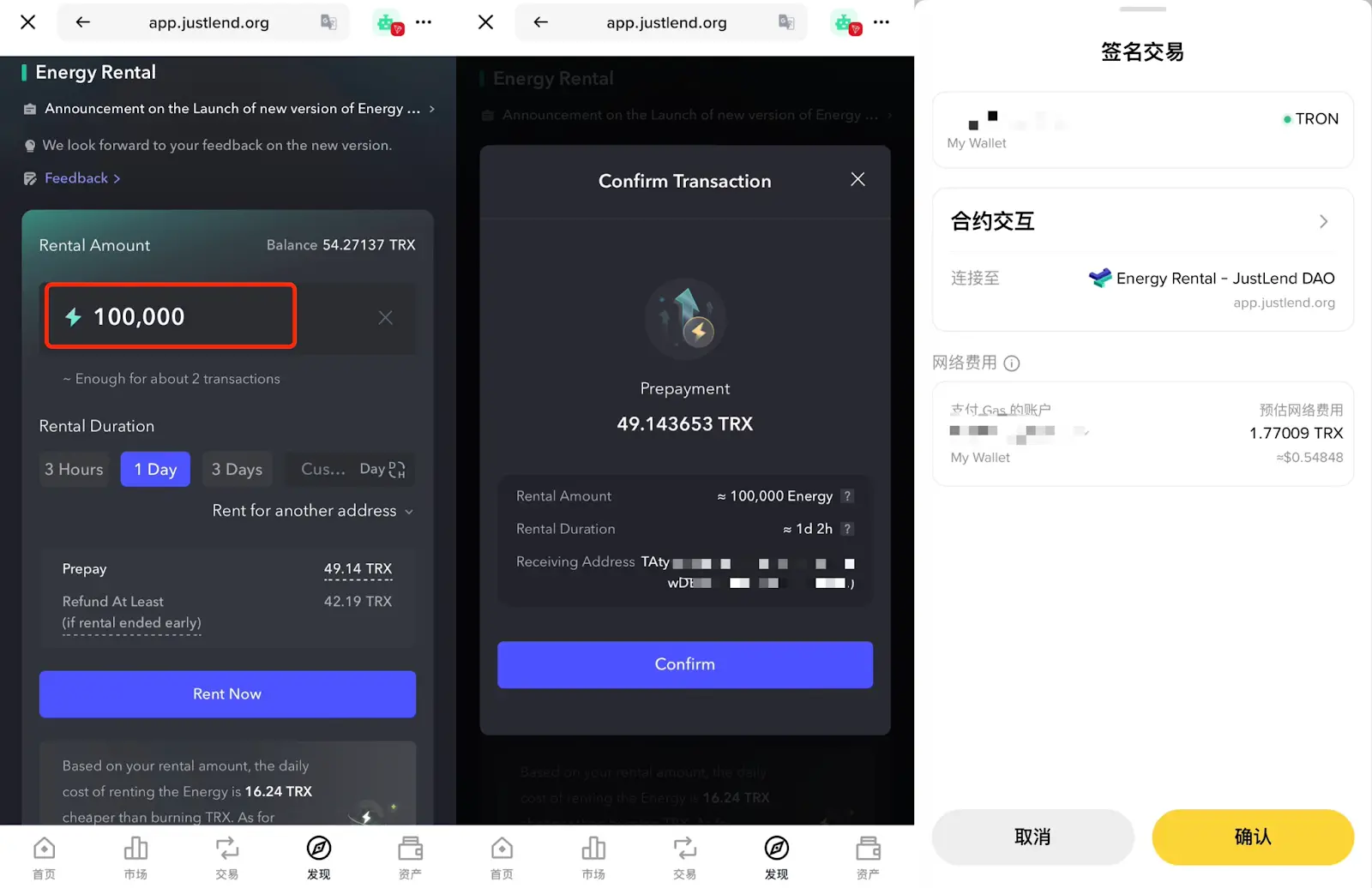 2、输入想要租赁的能量数量与租赁时长。系统会实时自动计算出所需预存的TRX以及退租时返还的TRX。点击“Rent Now”,在钱包中授权。租赁成功后,订单会自动出现在“Energy Rental”页面。