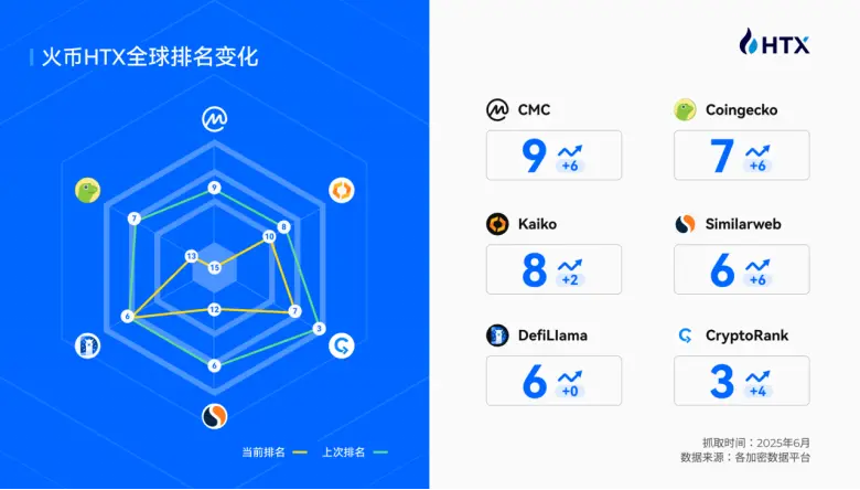 根据 Kaiko 2025 年第二季度报告,火币 HTX 在全球45家主流现货交易平台中排名上升两位,成功跻身全球前八,成为 Top 10中进步幅度最大的交易所。在商业和技术两个维度中排名全球第二,在“安全”领域亦处于行业前列。此外,火币 HTX 在 CoinGecko 、 CoinMarketCap 、 DefiLlama 、 CryptoRank 等全球权威数据平台中的排名持续上升,逐步跻身 Web3 用户心中的一线平台。